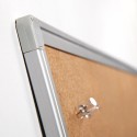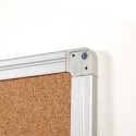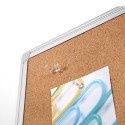 Tablero de corcho natural recercado en marco de aluminio anodizado en plata mate y cantoneras en plástico gris redondeada. Con un grosor de 1 cm.